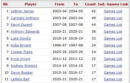 NBA历史青少年球员砍下20+的场次榜如下: