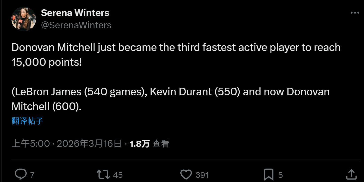 本场米切尔表现不错,24中10拿下26分1板11助2抢断,个人生涯总分突破15000分大关。